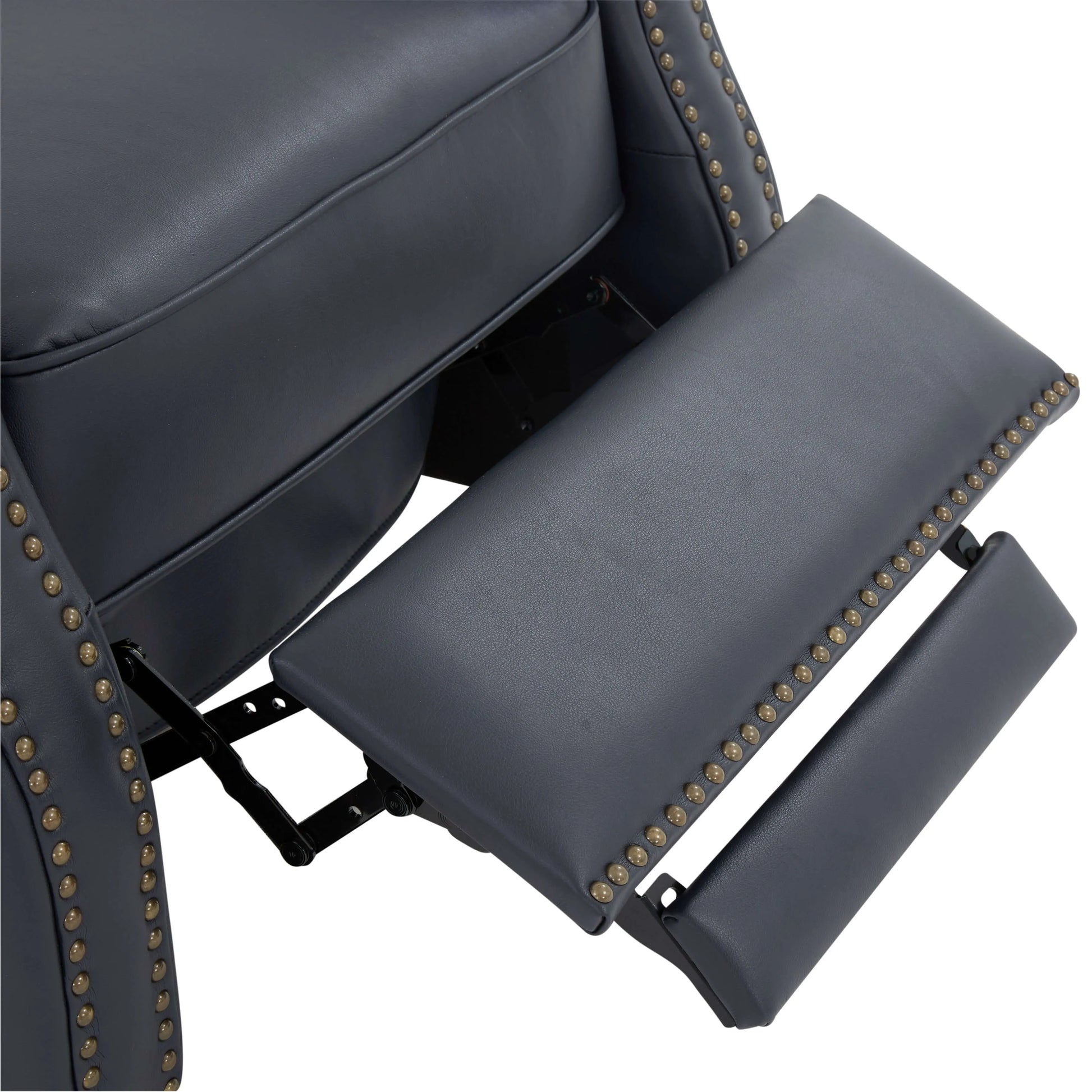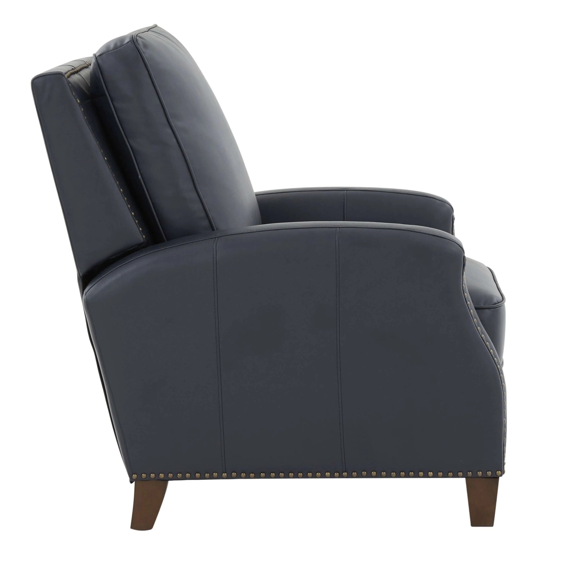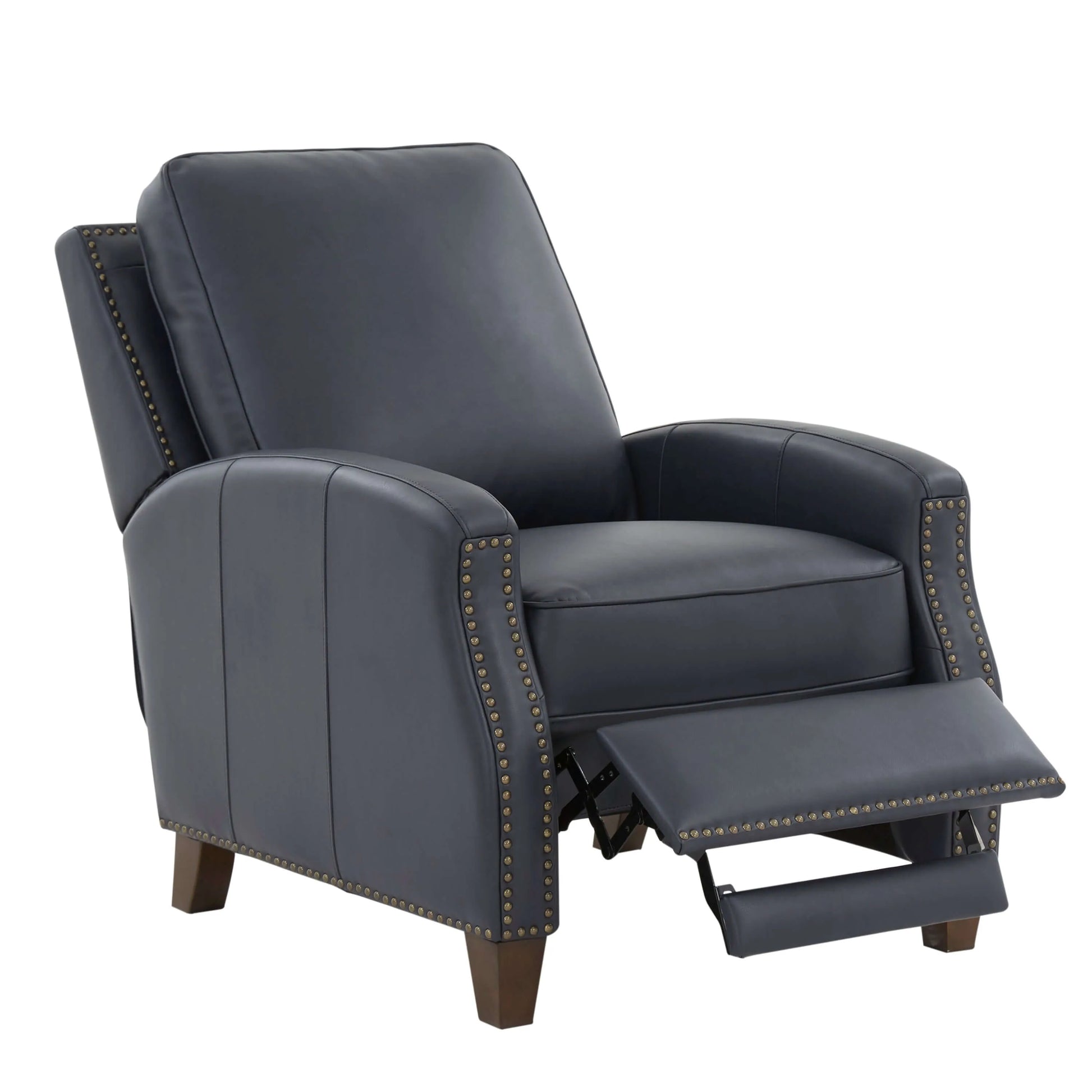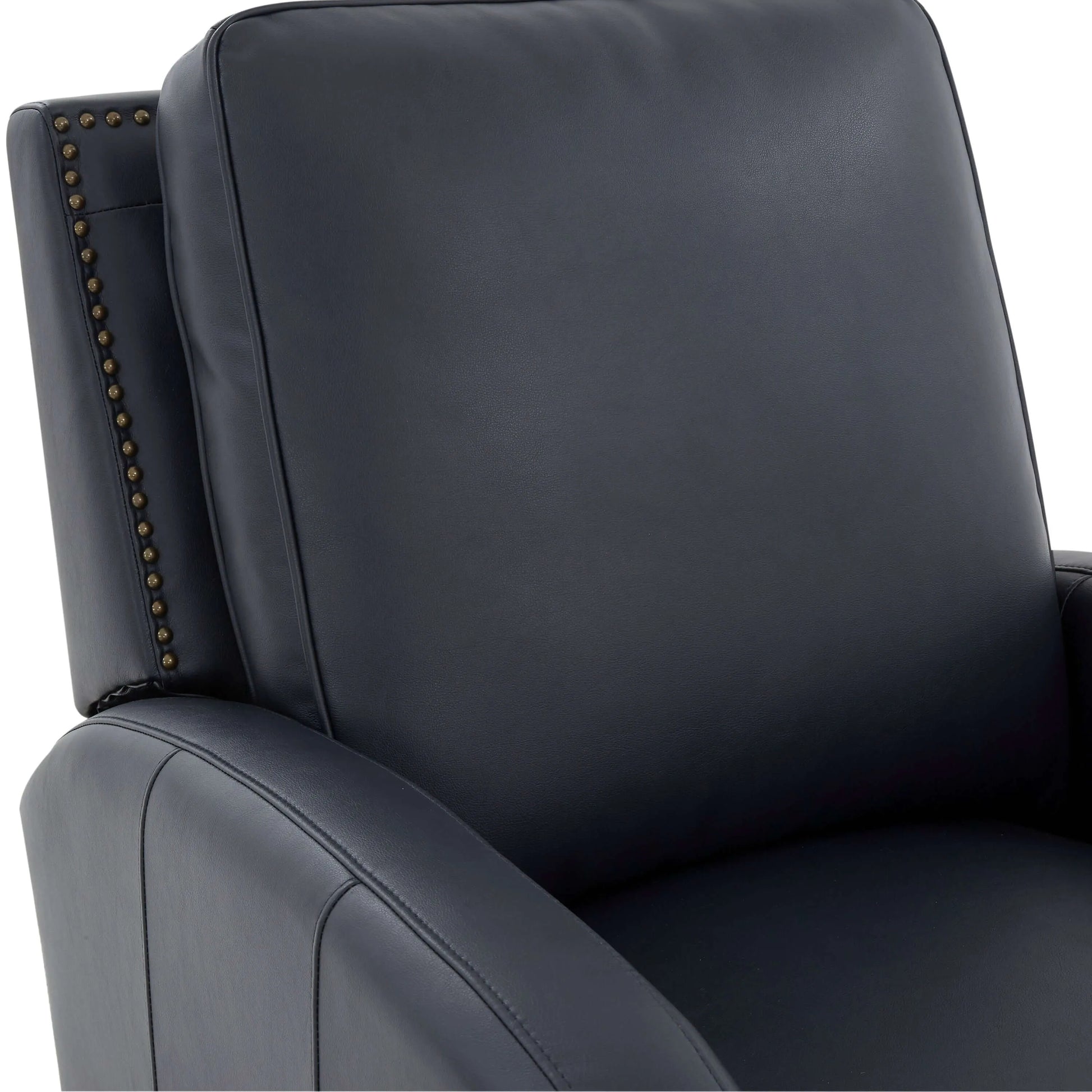 Classic elegance meets effortless comfort. The James Push Back Recliner combines timeless design with plush relaxation. Wrapped in rich midnight blue faux leather gel and featuring elegant brass nailhead trim with hardwood legs, this manual push back recliner delivers sophisticated style without the fuss. Simply lean back to recline—no levers, no buttons, just smooth, intuitive motion.